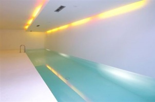 Die Schwimmhalle als auch das Becken sind komplett in Weiß gehalten. Mit der in der Decke integrierten Beleuchtung lassen sich durch Farbwechsel unterschiedlichste Stimmungen erzeugen.