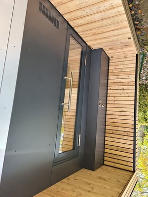 Im Inneren der Sauna sind Softline-Profilbretter aus Espe gewählt worden. Die Ganzglastür ist aus Sicherheitsglas und neben der Tür wurde ein wetterfester Technikschrank in gleicher Außenoptik untergebracht.