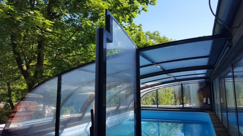 Ein vorhandener Pool auf einer Dachterrasse sollte aufgrund der hohen Wärmeverluste und des erheblichen Laubbefalls durch eine verschiebbare Schwimmbad-Überdachung geschützt werden. Aufgrund des geringen Platzes und der Optik wurde eine Seite der Laufschienen direkt an der Hauswand unterhalb der Regenrinne befestigt. Die Laufschienen und die gesamte ALU-Konstruktion wurde in einer speziellen RAL-Farbe pulverbeschichtet, die zu den Fensterbeschlägen des Hauses passte.